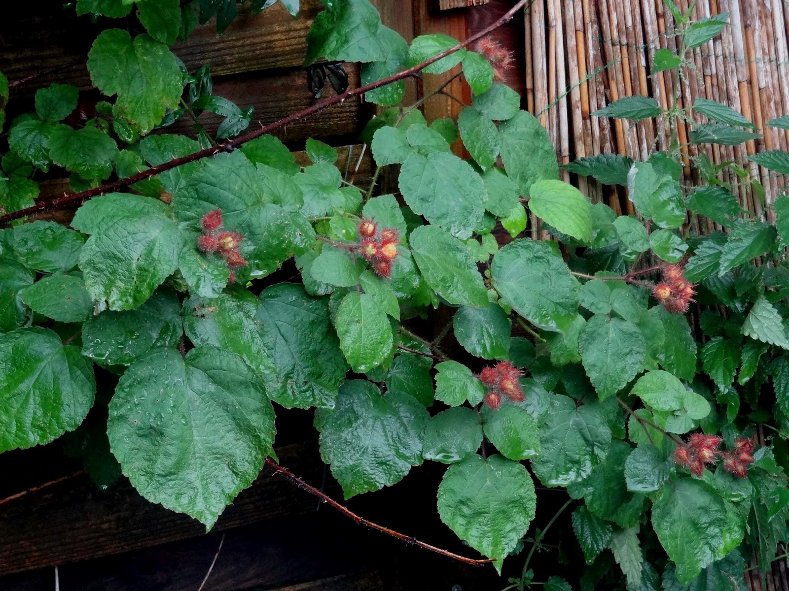 die japanische Weinbeer-Staude bekommt auch schon Beeren…