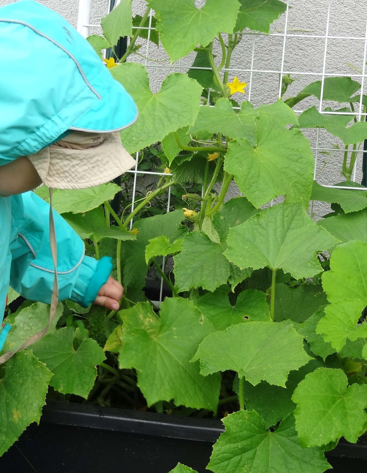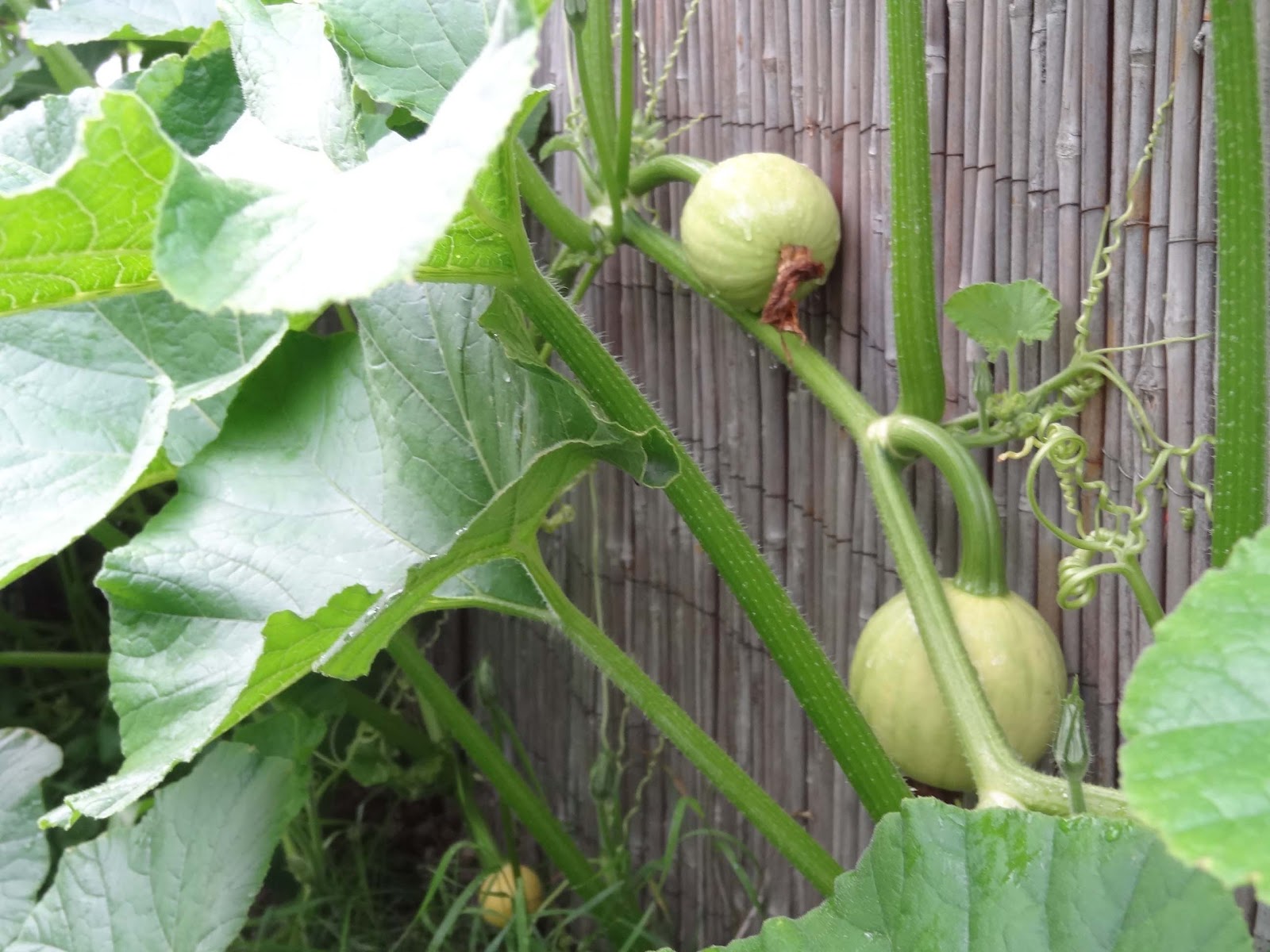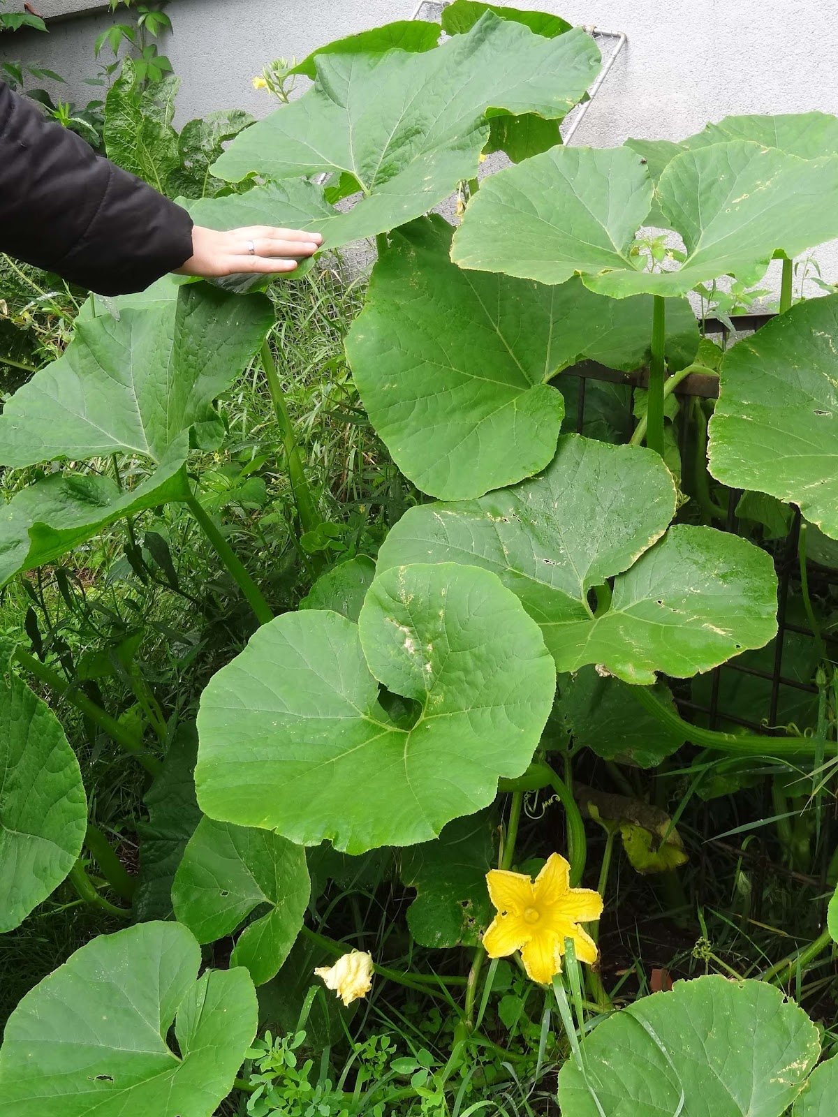 einer der Kürbisse hat sehr große Blätter..