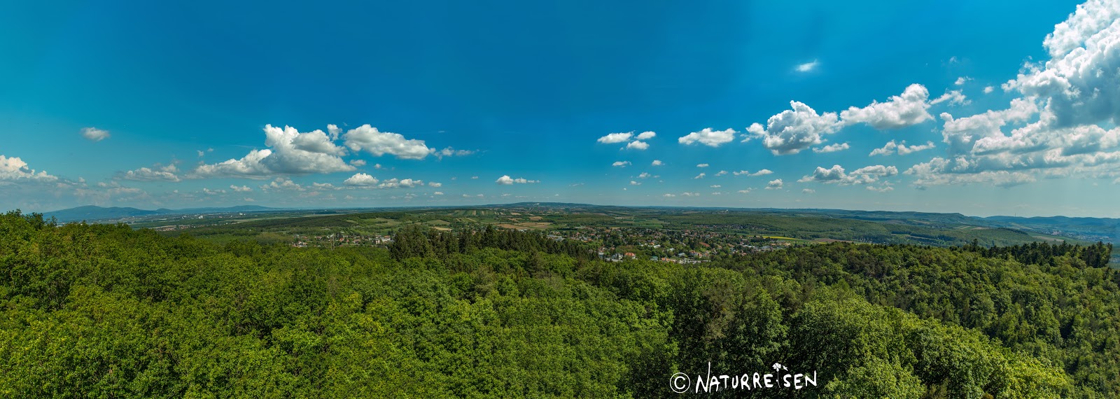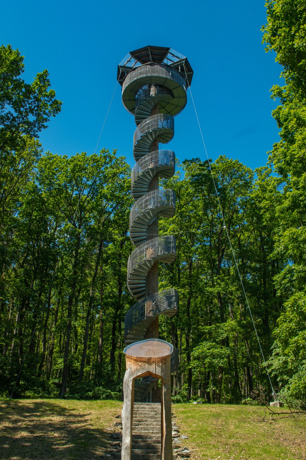 133 Stufen muss man erklimmen, wenn man auf die Aussichtsplattform vom Aussichtsturm rauf will. Der Aufstieg lohnt sich aber, denn die Aussicht reicht über das Rosaliengebirge bis hin zum Neusiedler See und zum Schneeberg, sogar nach Sopron und Bratislava. Der 28 Meter hohe Turm windet sich um einen 100 Jahre alten Baumstamm.