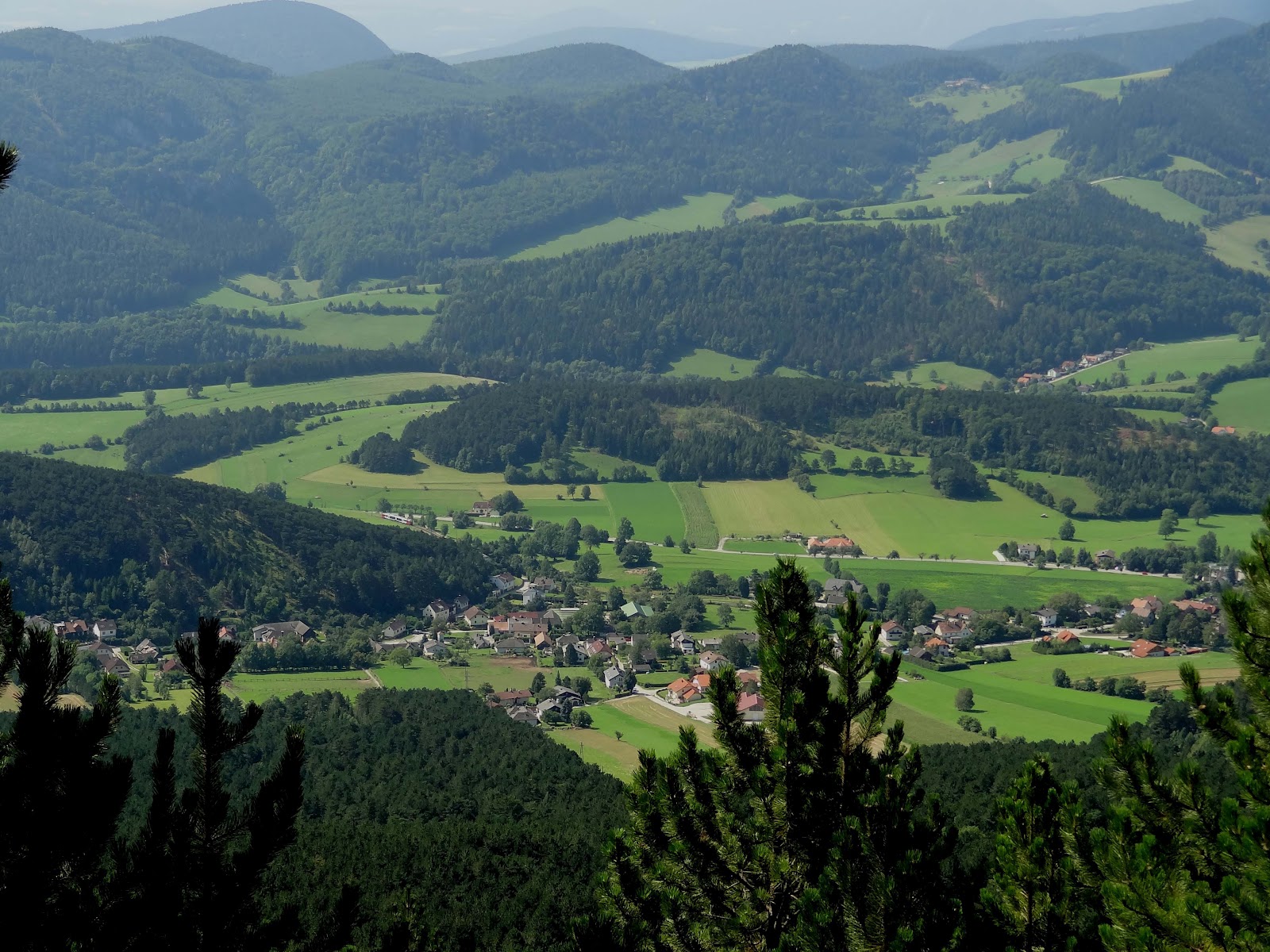 nach dem Abstieg: Blick auf einen Ortsteil von Grünbach mit dem ehemaligen
